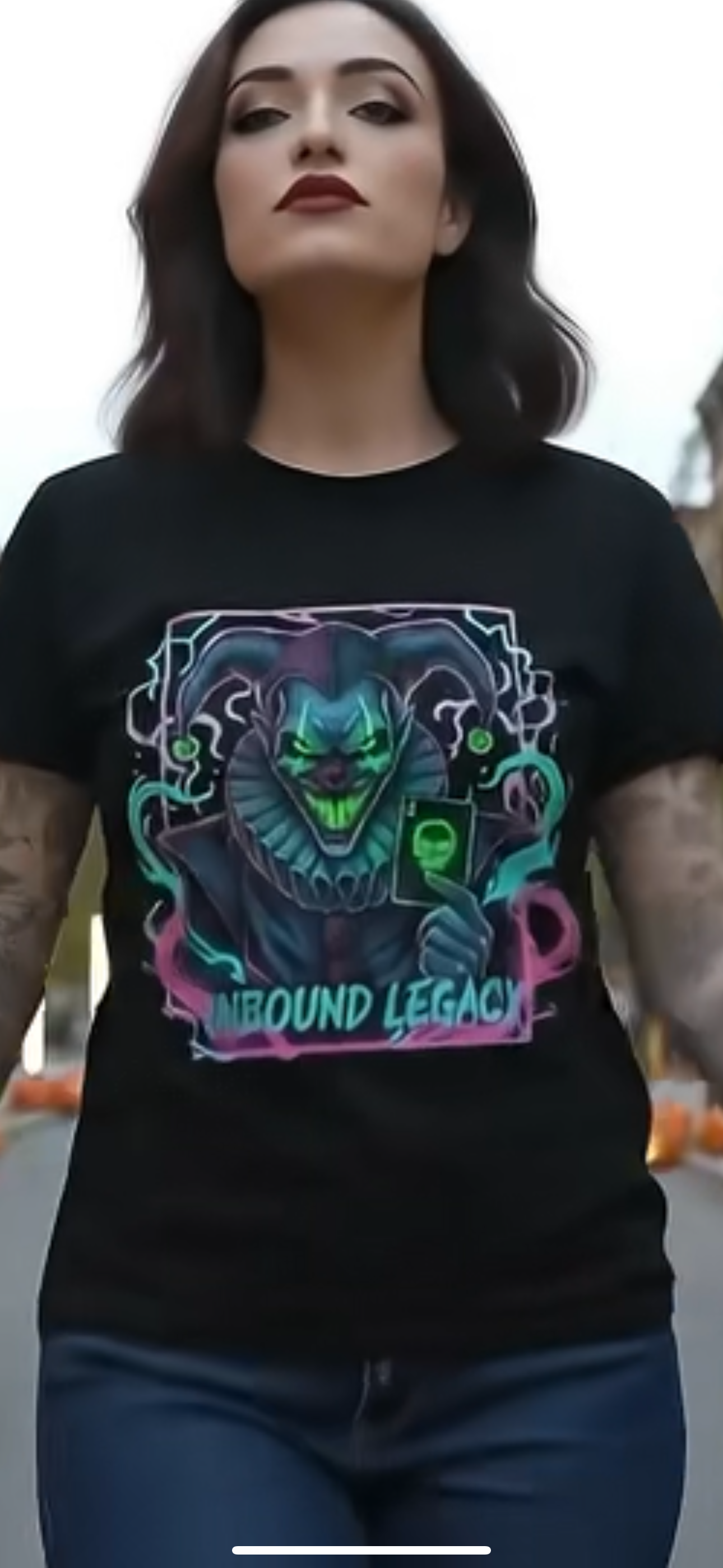 The Trickster's Nightmare Tee showcases the ultimate agent of chaos, framed by a glitching aura of neon pink and toxic green. With a skull card held high, this design embodies the moment the mischief stops and the mayhem begins.